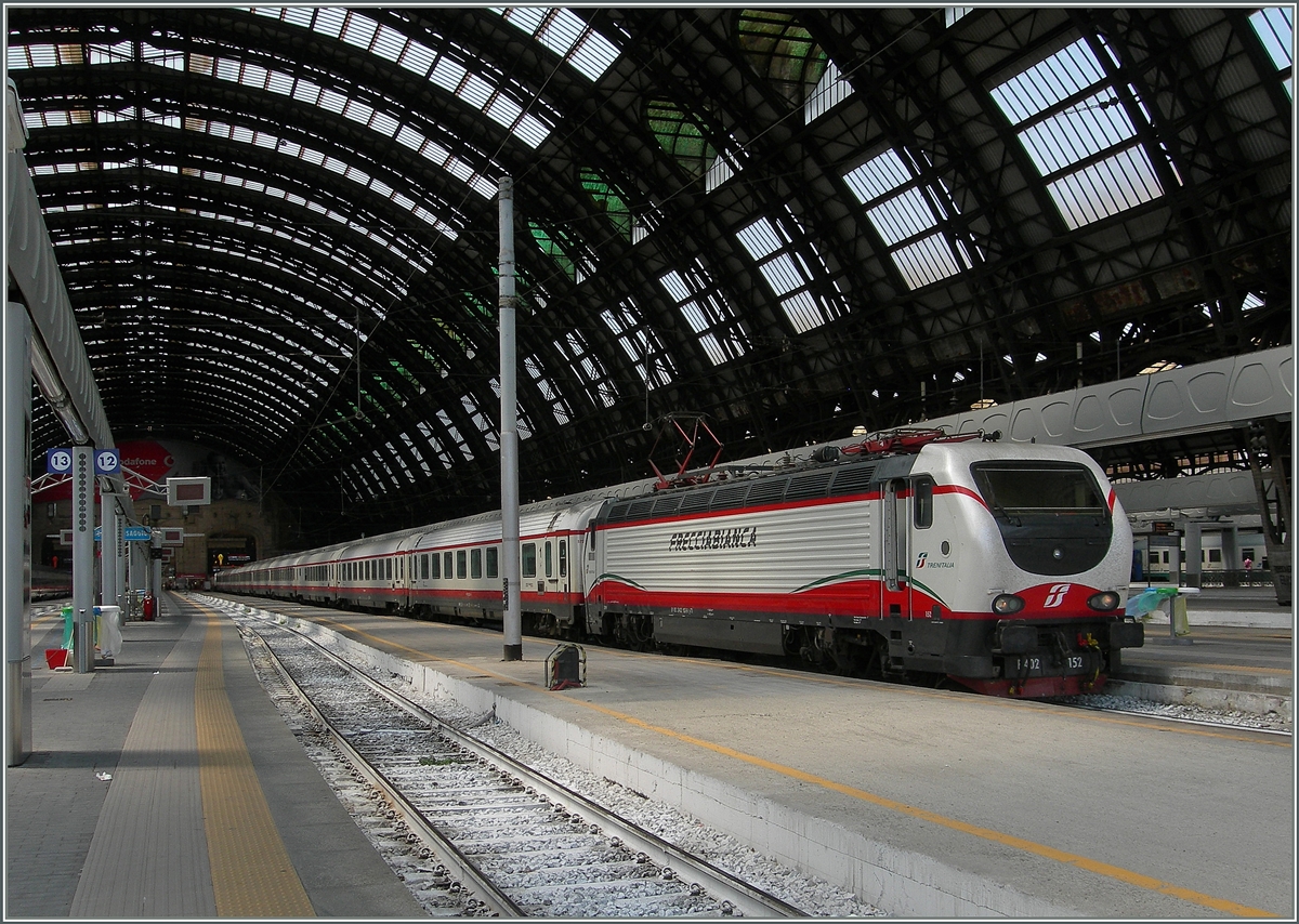 Die FS E 402 152 wartet in Milano Centrale mit einem Freccaibianco auf die Abfahrt.