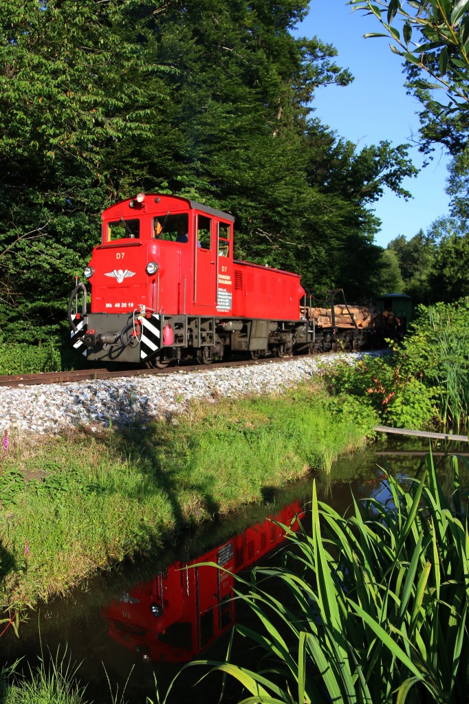 D7 (Mk 48.2019) mit einem Fotogüterzug auf der Stainzbahn im Wald zw. Wohlsdorf und Kraubath am 26.6.2015.