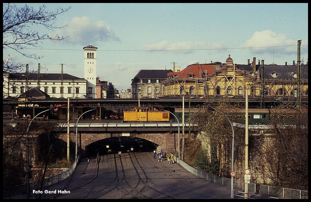 Über der Unterführung im HBF Erfurt rangierte am 21.11.1990 106832 einige Personenwagen der DR.