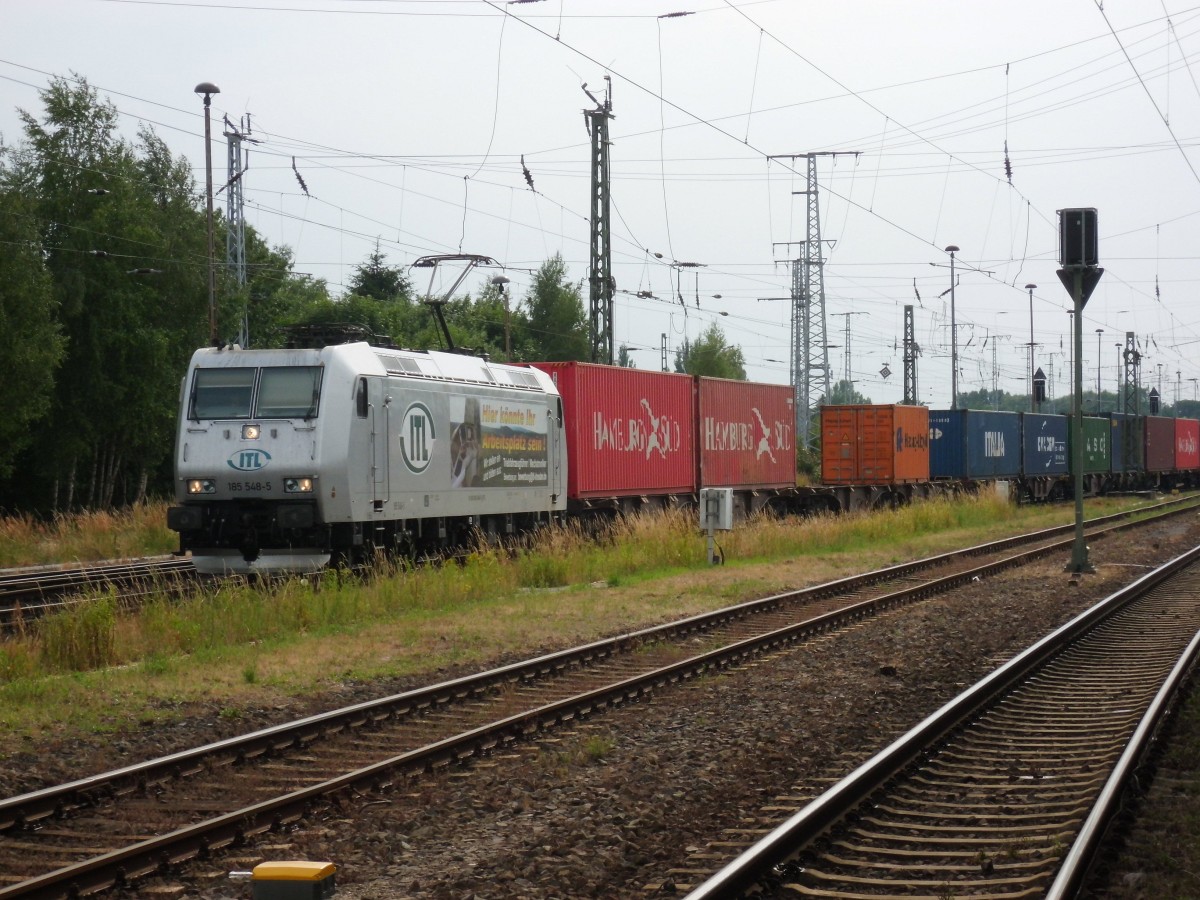 Am 27.06.2015 kam 185 548 mit ihrem Containerzug aus Richtung Salzwedel nach Stendal und fuhr weiter nach Magdeburg.