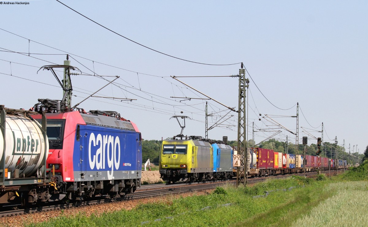 185 256-5 mit einen Containerzug überholt einen anderen Containerzug am 10.06.15 bei Fulda.