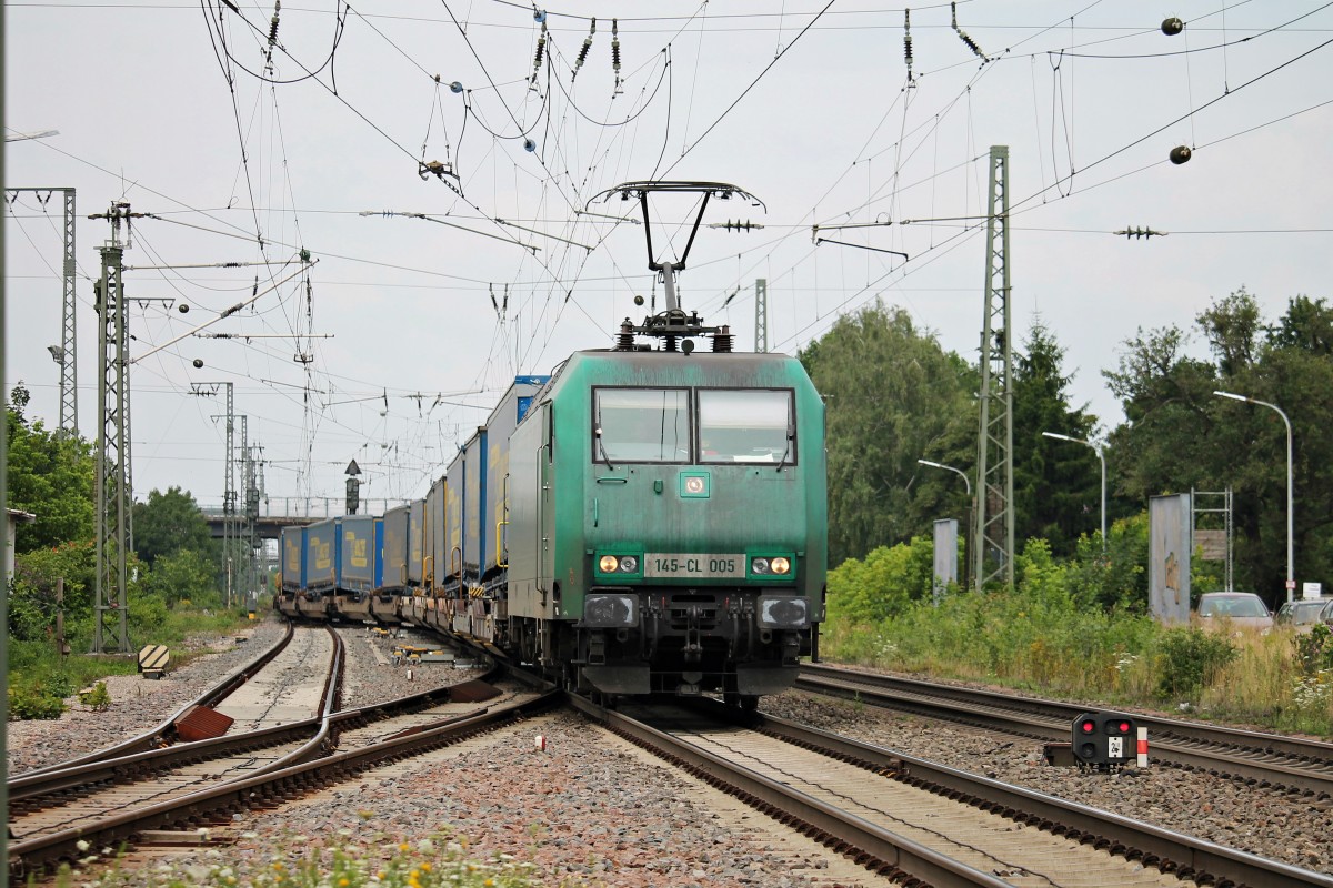 145 100-4D-XRAIL(Cross Rail)zieht einen Containerzug durch das Wurmtal auf der KBS 485, in Richtung Mönchengladbach mitgezogen am 27.6.2015