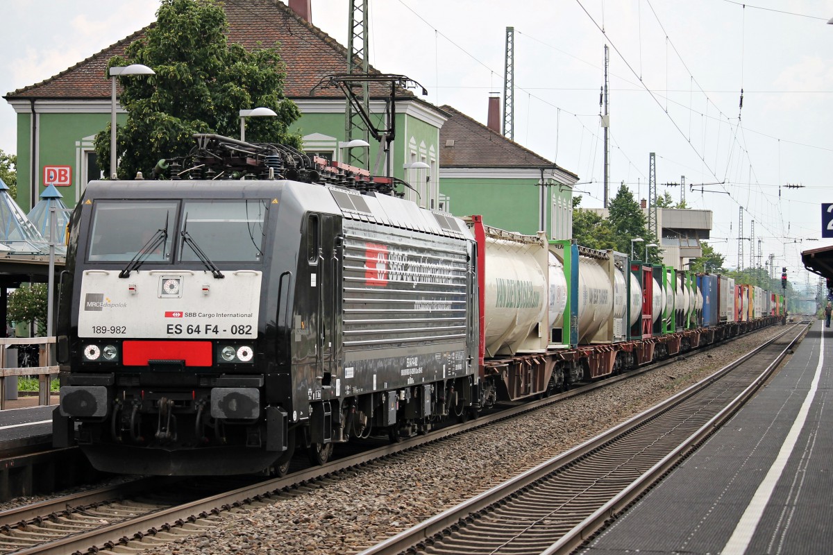 Bei der Durchfahrt von Müllheim (Baden) befindet sich am 23.07.2014 die ES 64 F4-082 von SBB Cargo mit einem Containerzug.