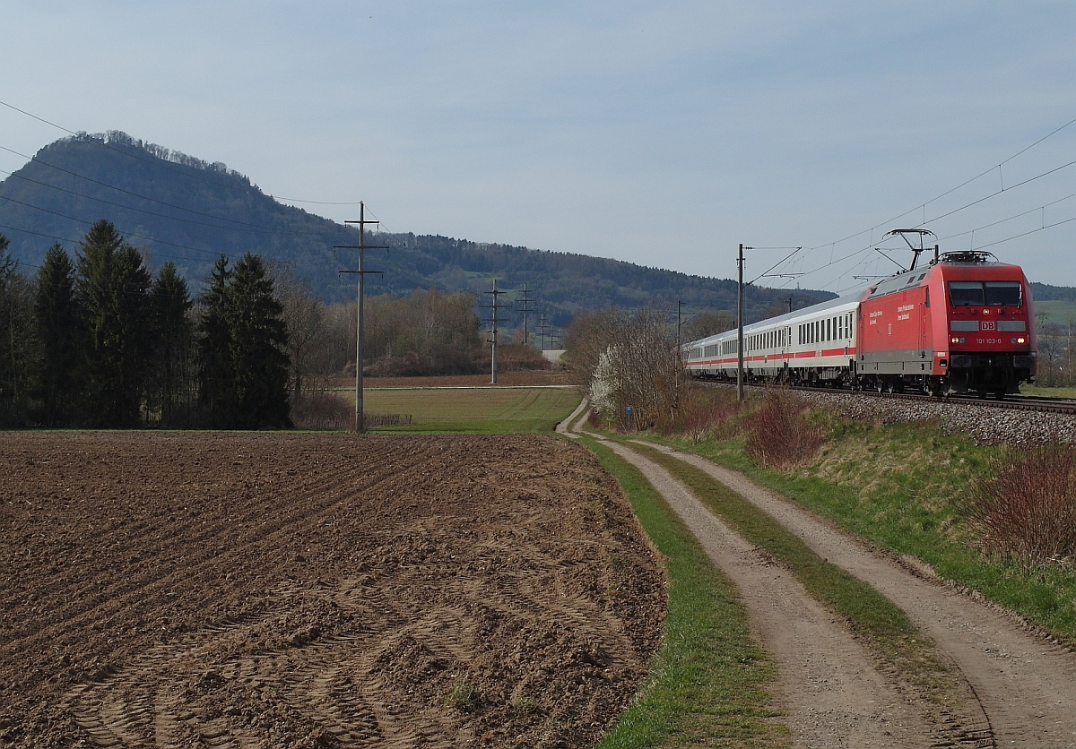 Das Ziel fast erreicht hat 101 103-0 mit dem IC 2005 'BODENSEE' von Emden nach Konstanz. Das Bild mit dem Hausberg von Engen, dem 846 m.ü.M liegenden Hohenhewen, wurde am 10.04.2015 bei Welschingen-Mühlhausen aufgenommen.