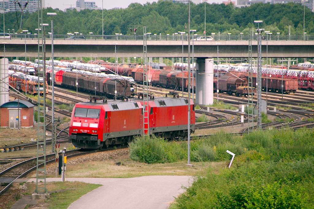 Die beiden 152er 017 und 100 nehmen den rechten Weg in die Abstellanlage. Unter der Straßenbrücke werden sie kehrt machen. (27.06.2015)