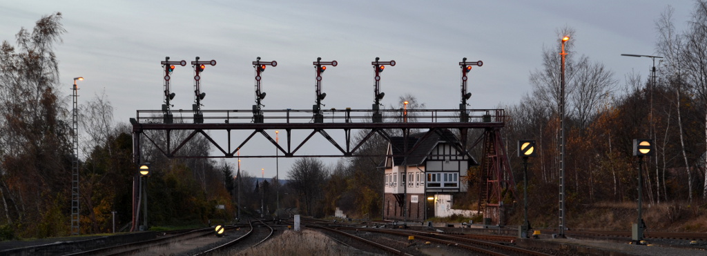 Die bekannte Signalbrücke von Bad Harzburg in der Abenddämmerung. 23.11.2014