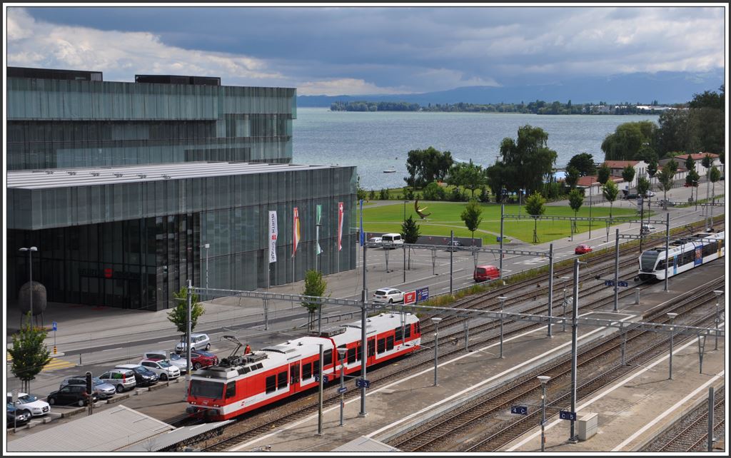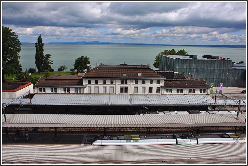 Fotografiert vom neuen Turm des Personenlifts zur erhöhten Stadt. Bahnhof Rorschach mit Blick über das Schwäbische Meer. (23.06.2015)