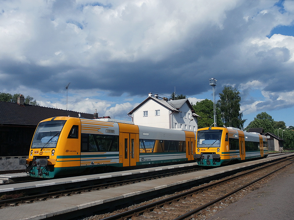 Die Wagen VT 650.65, 72 - 74 werden auf die Tschechische Bahn vermietet. Züge 841.73 und 74 waren am 19.6.2015 in Doudleby nad Orlicí.