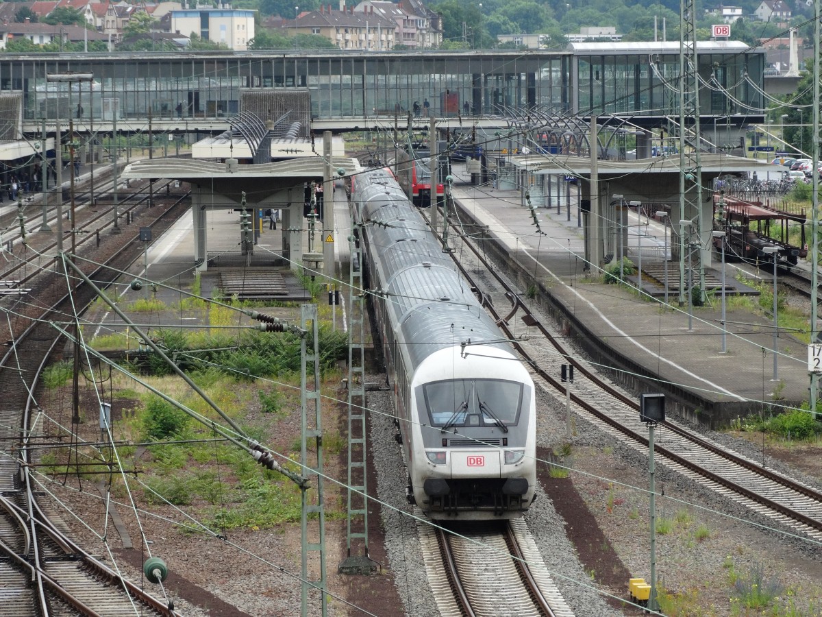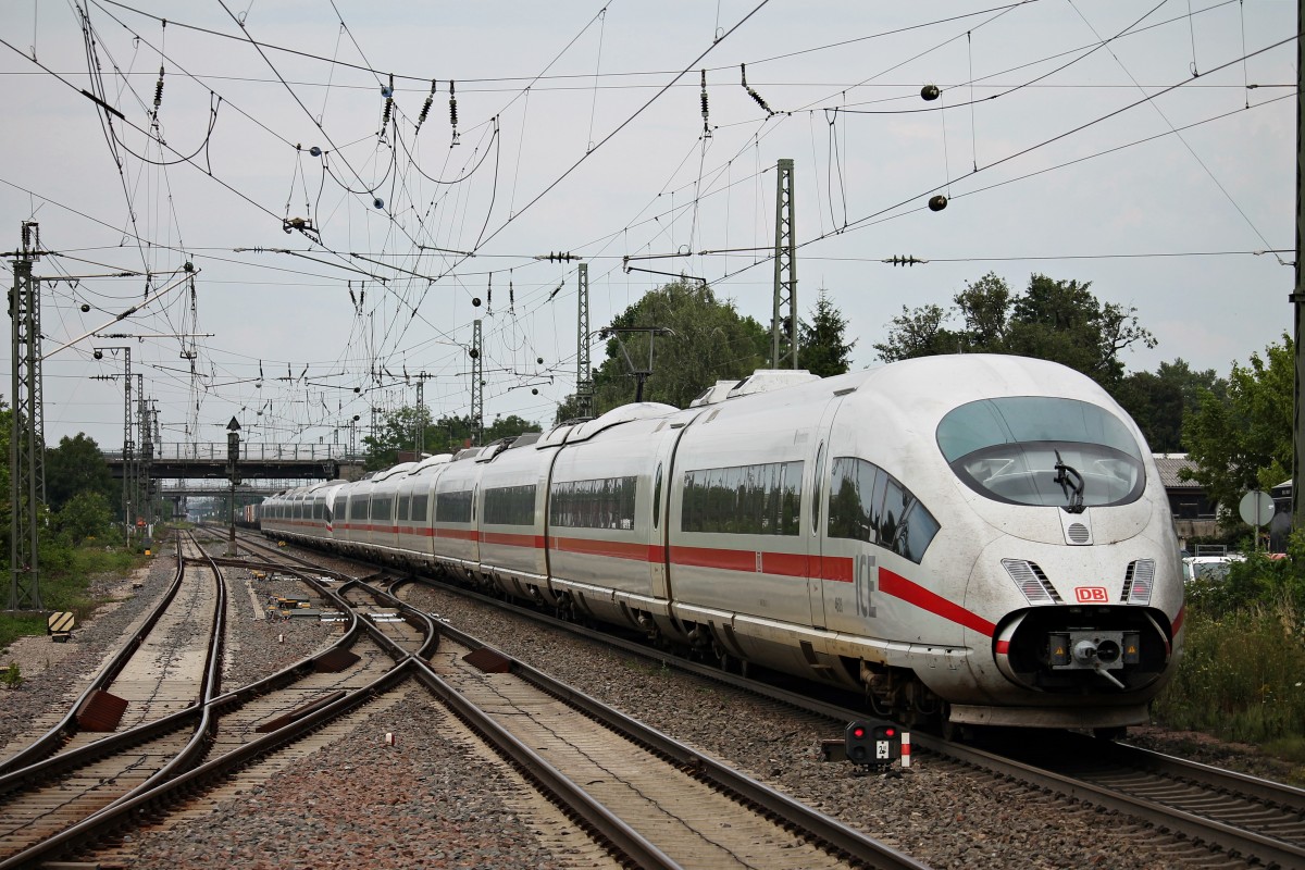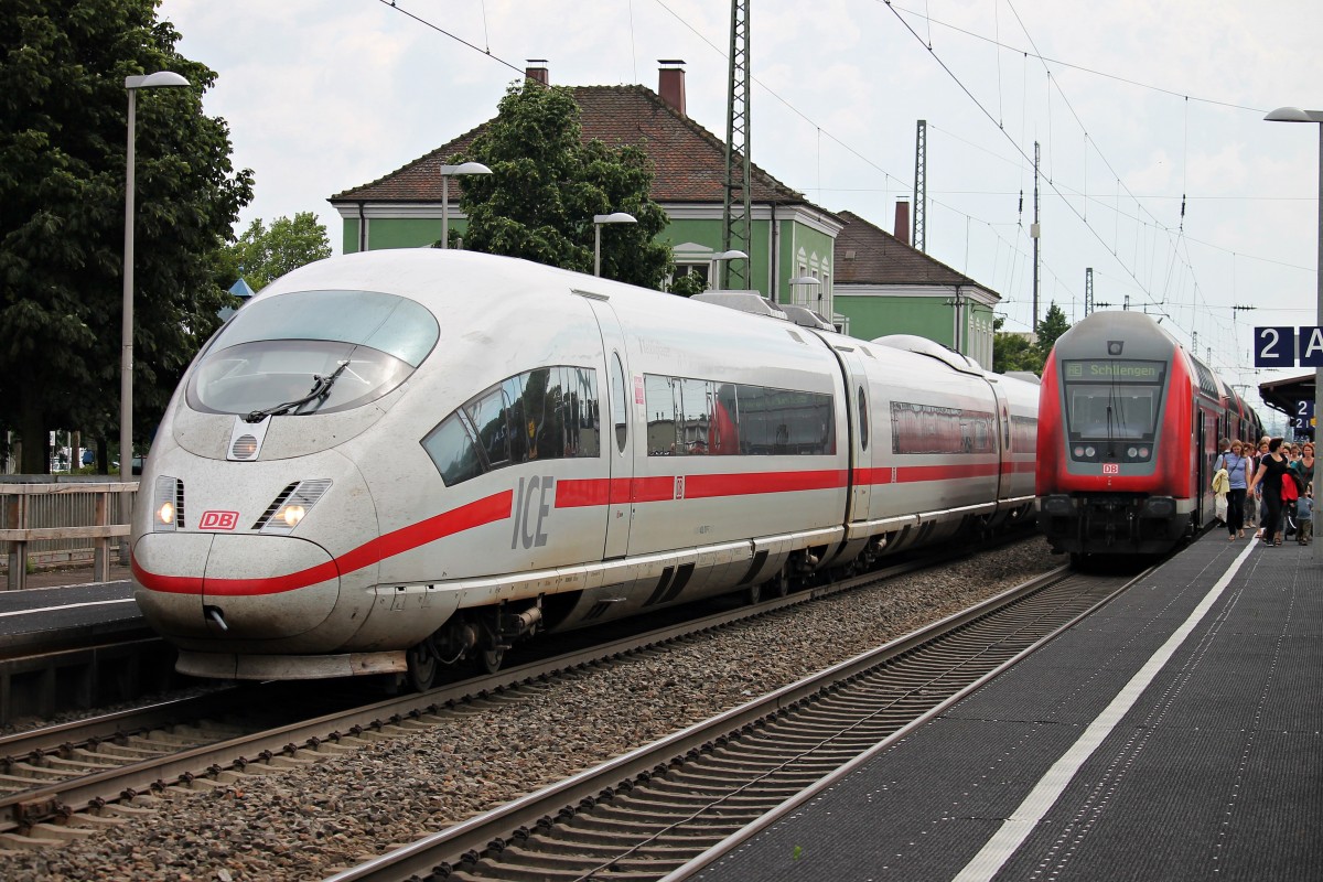 Nachschuss auf 406 503-3 "Mannheim" und 403 017-7 "Recklinghausen" am 23.07.2014 bei der Ausfahrt aus Müllheim (Baden) gen Freiburg (Breisgau).