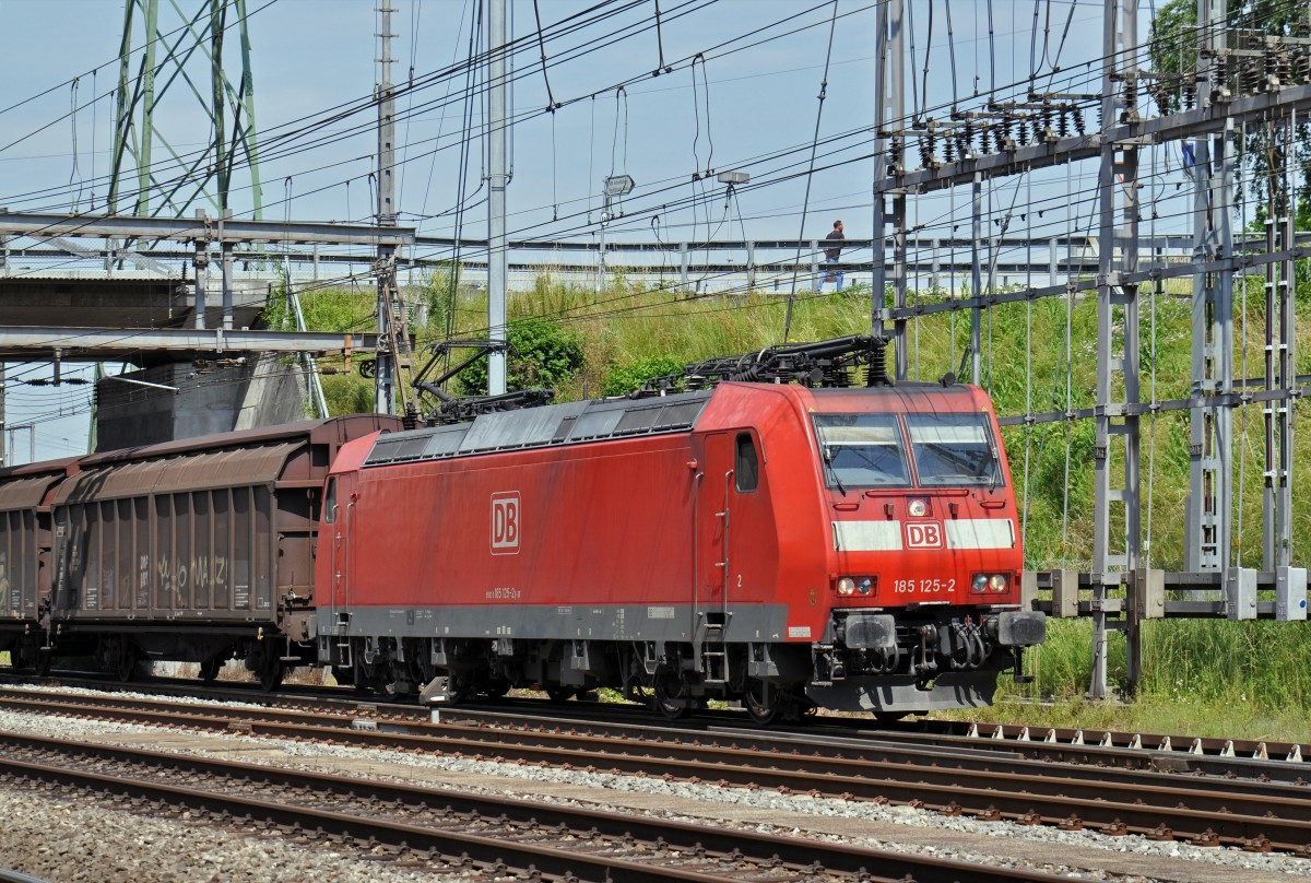 Lok 185 125-2 durchfährt den Bahnhof Muttenz. Die Aufnahme stammt vom 12.06.2015.