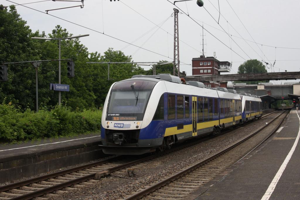 NWB VT 648083 fährt am 26.6.2015 um 17.59 Uhr im unteren Bahnhof von Osnabrück nach Wilhelmshaven ab.
