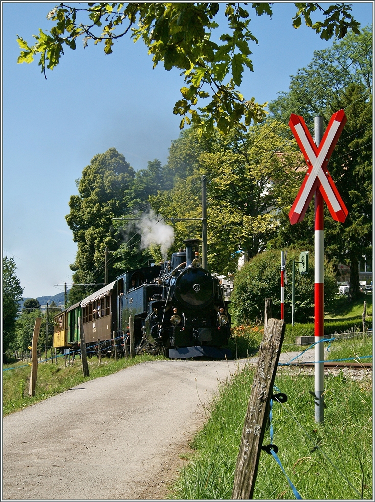 Vorsicht, ein Zug kommt - ein Andreaskreuz warnt den Wanderer vom Blonay-Chamby Dampfzug, der in Kürze Chaulin erreichen wird.