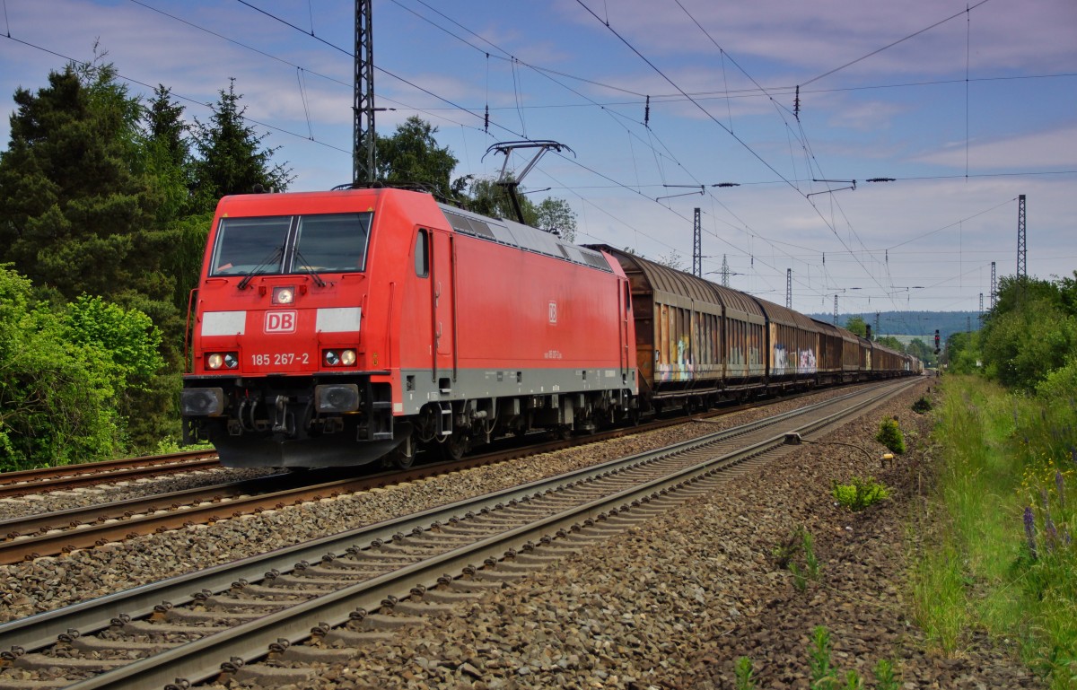 185 267-2 mit einen Schiebewandzug in Richtung Süden unterwegs am 10.06.15 vor Fulda.