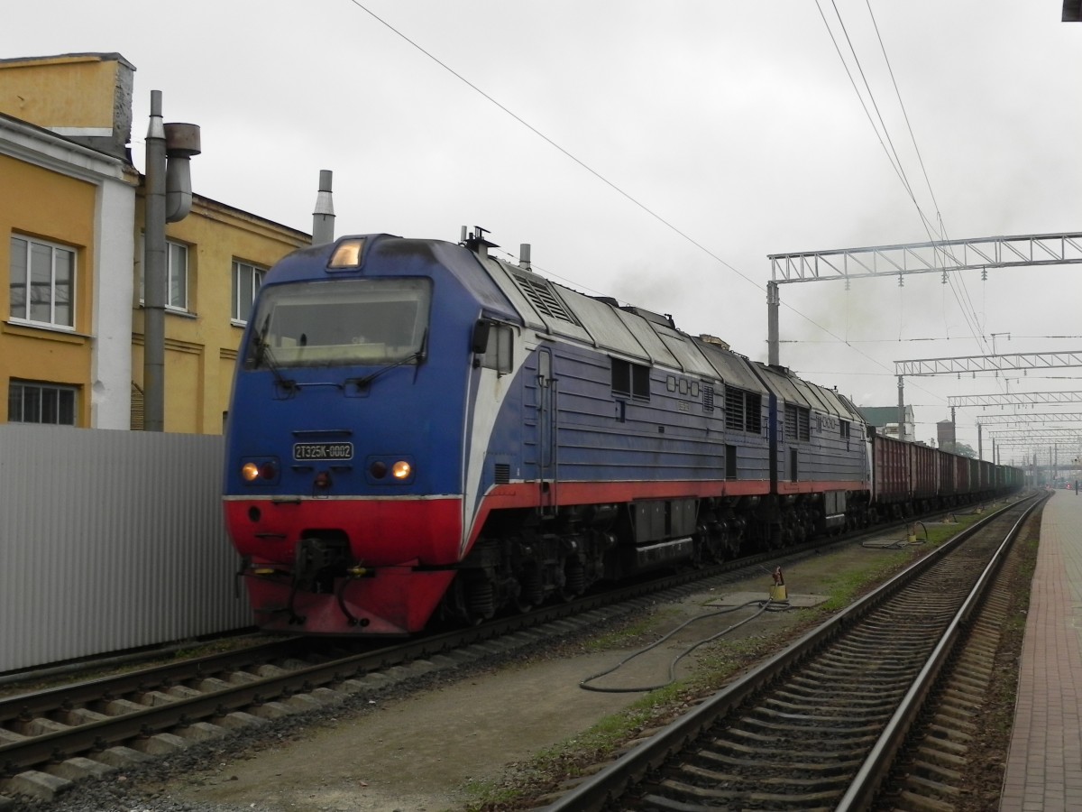 2T325K-0002 durchfährt den Bahnhof Gomel in Richtung Russische Grenze bei Dobrusch. 28.05.2015 gegen 15:00 Uhr.