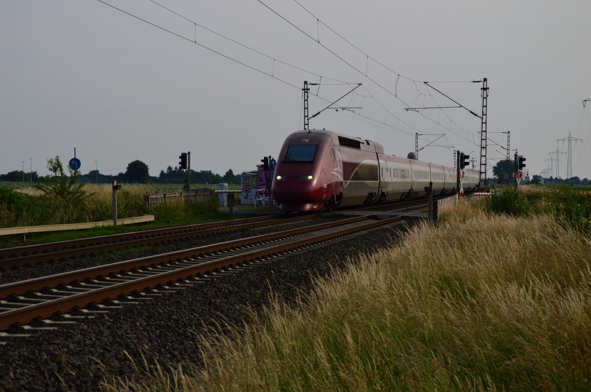 Aus Aachen kommt der Umleiter Thalys 4321 bei Wickrathhahn am Bü In der Schley/Am Chur gen Rheydt gefahren, wo er Kopf macht und dann über Grevenbroich nach Köln fahren wird.29.6.2015
