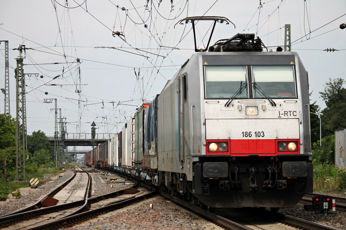 BLS Cargo 186 103 am 23.07.2014 mit einem Containerzug in Müllheim (Baden).