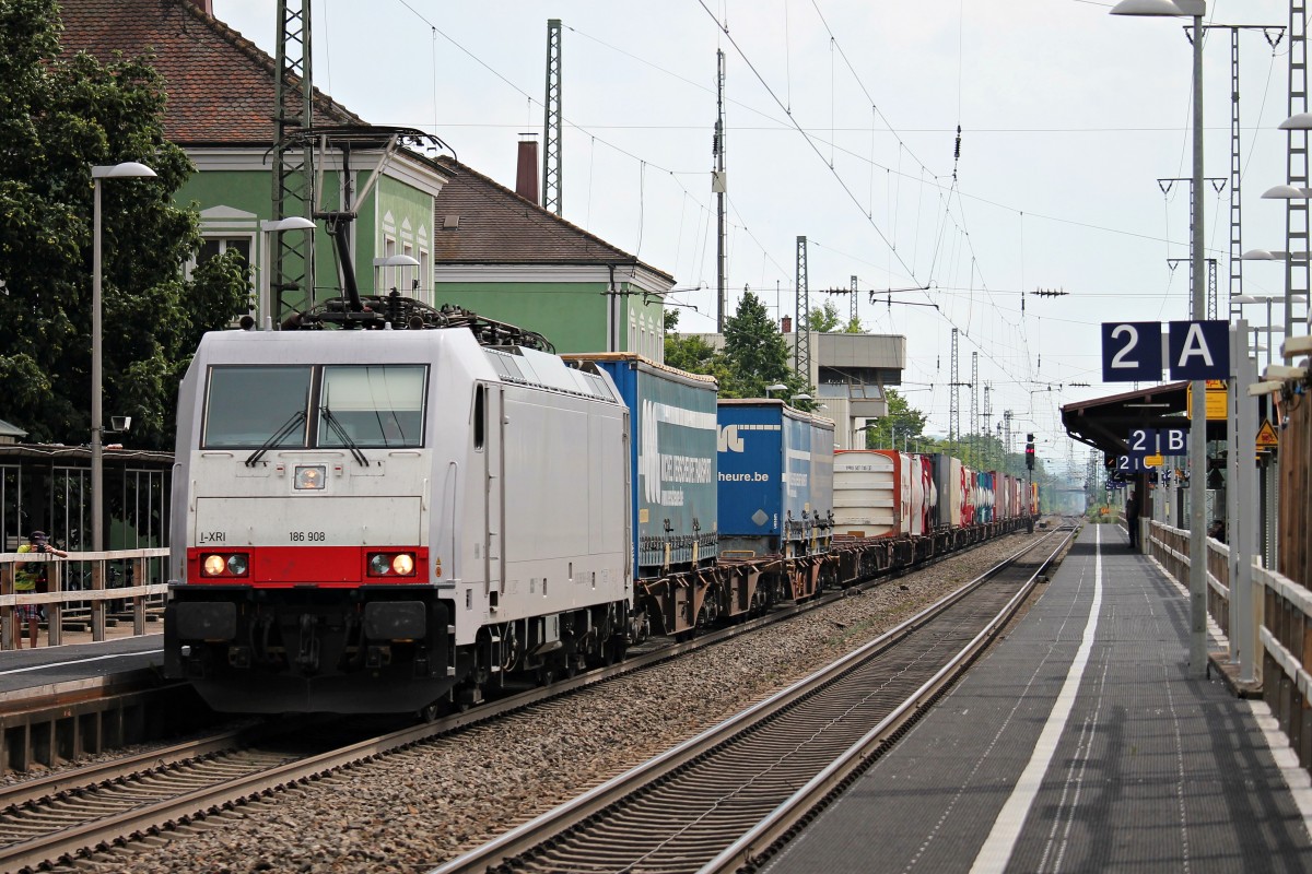 Crossrail Italia 186 908 am 23.07.2014 mit einem Containerzug in Müllheim (Baden) gen Norden.