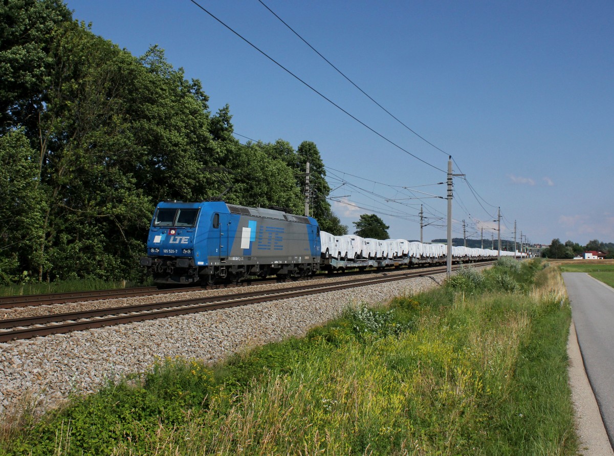 Die 185 528 mit einem Autozug am 28.06.2015 unterwegs bei Taufkirchen a. d. Pram.