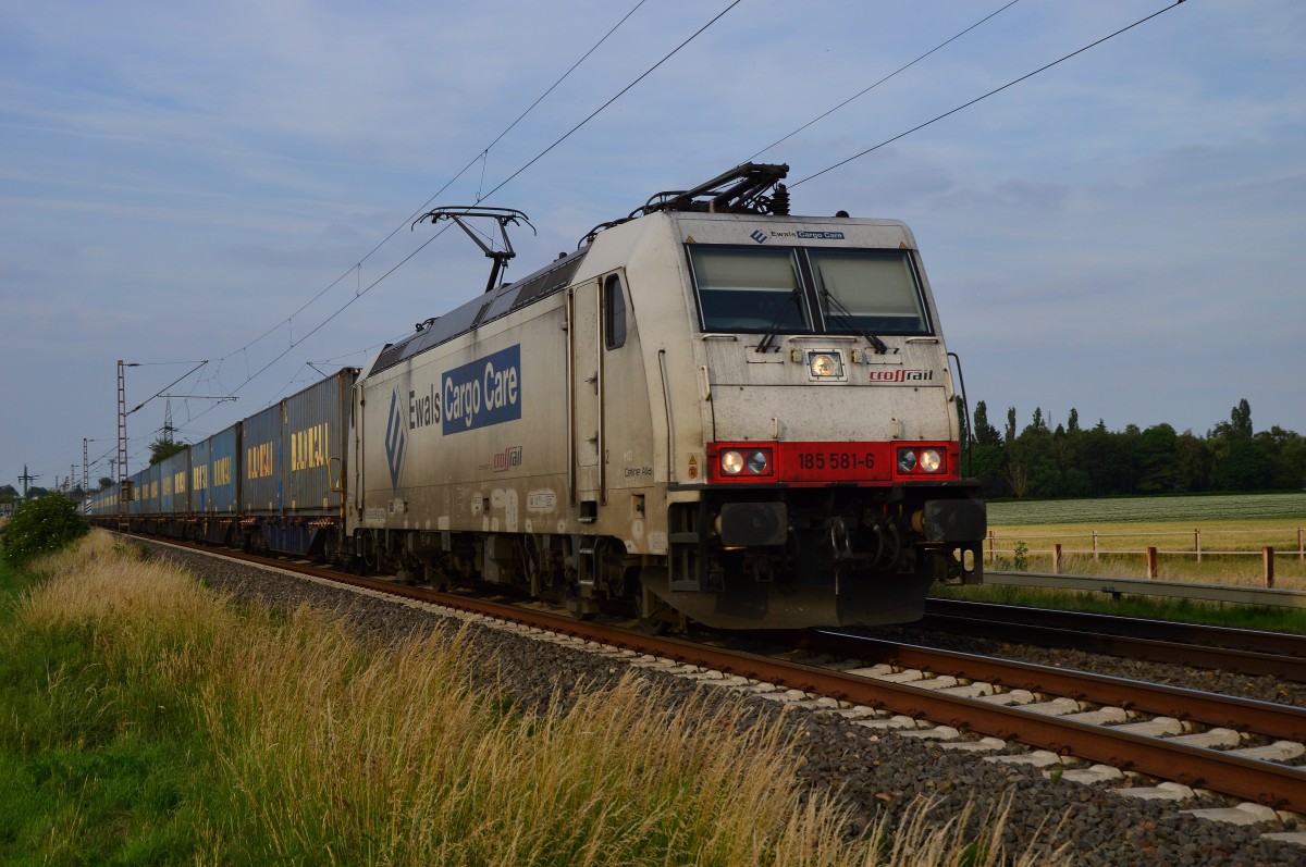 Die Crossrail 185 581-6 mit einem Bulkhaulcontainerzug am Haken bei Wickrathhahn gen Aachen West gefahren am Abend des 29.6.2015