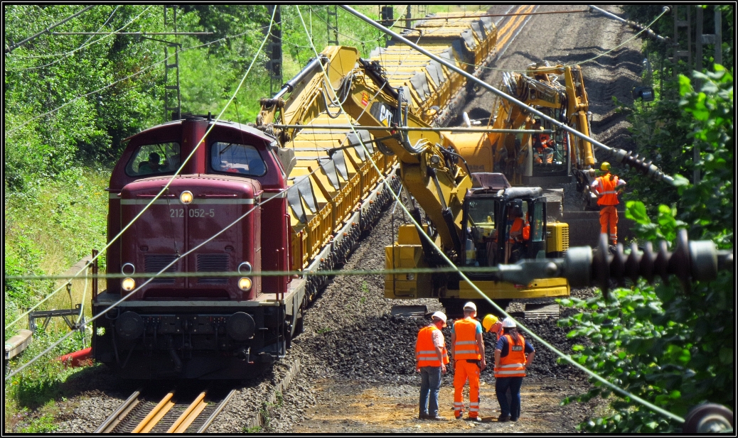 bei den Arbeiten. Die 212 052-5 der Efw drückt ihre Altschotterladung immer ein wenig bei,damit die Bagger in einen Arbeitsgang laden können. Szenario vom 29.Juni 2015.