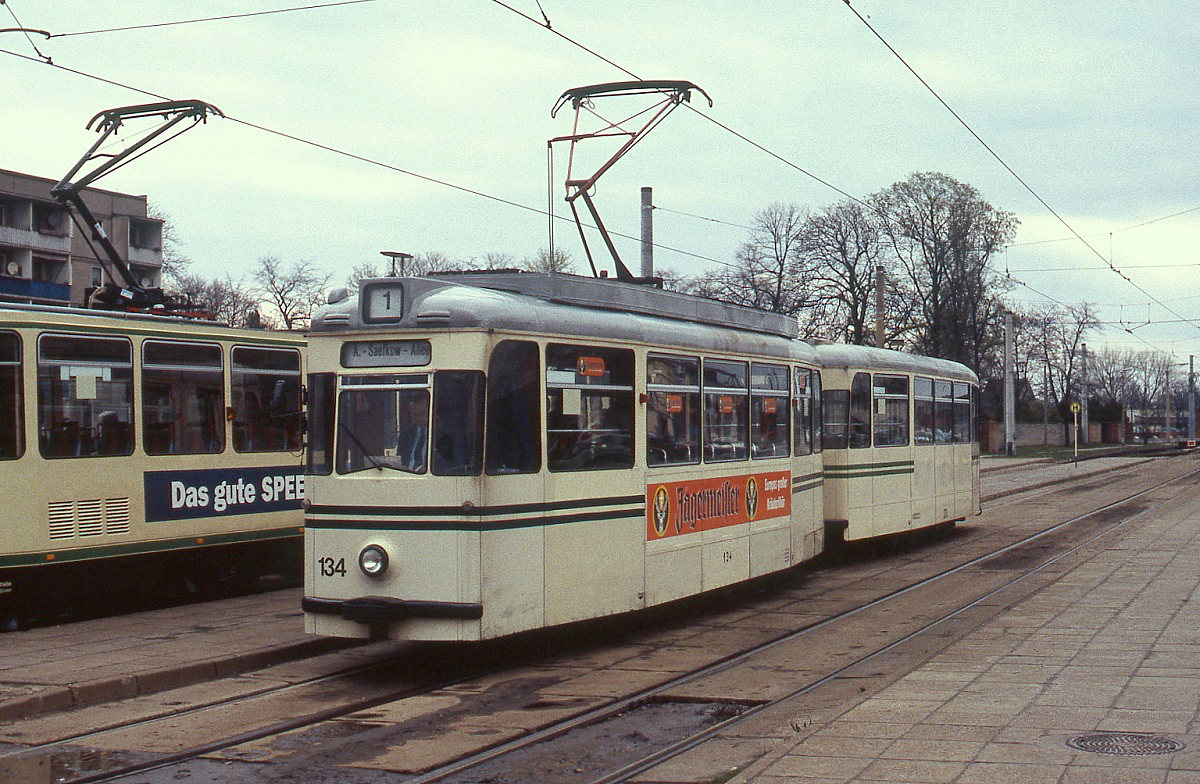 Im Frühjahr 1994 steht der Tw 134 der Brandenburger Straßenbahn als Linie 1 abfahrbereit in Richtung Anton-Saefkow-Allee vor dem Hauptbahnhof