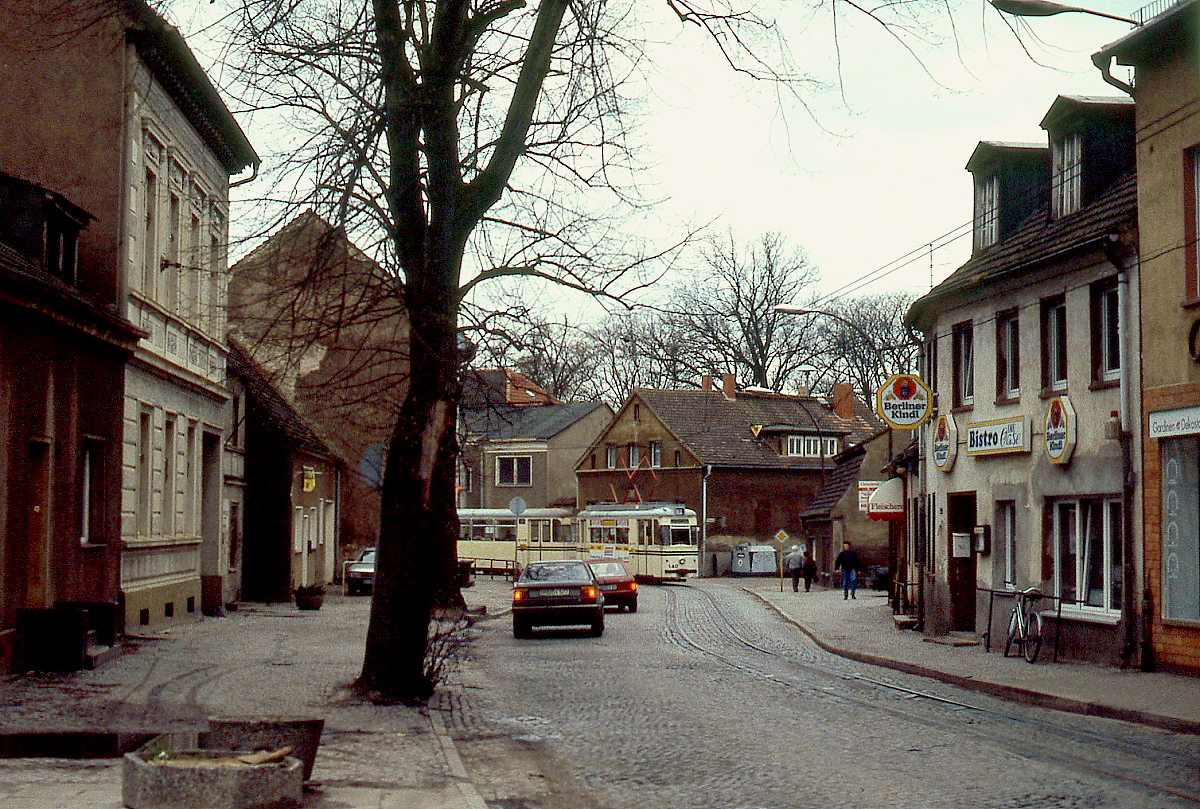 Im Jahre 2002 wurde die Überlandstrecke der Brandenburger Straßenbahn nach Kirchmöser West stillgelegt. Im Frühjahr 1994 passiert Tw 140 die enge Ortsdurchfahrt in Plaue, stressig für Straßenbahner, Autofahrer und Fotografen.