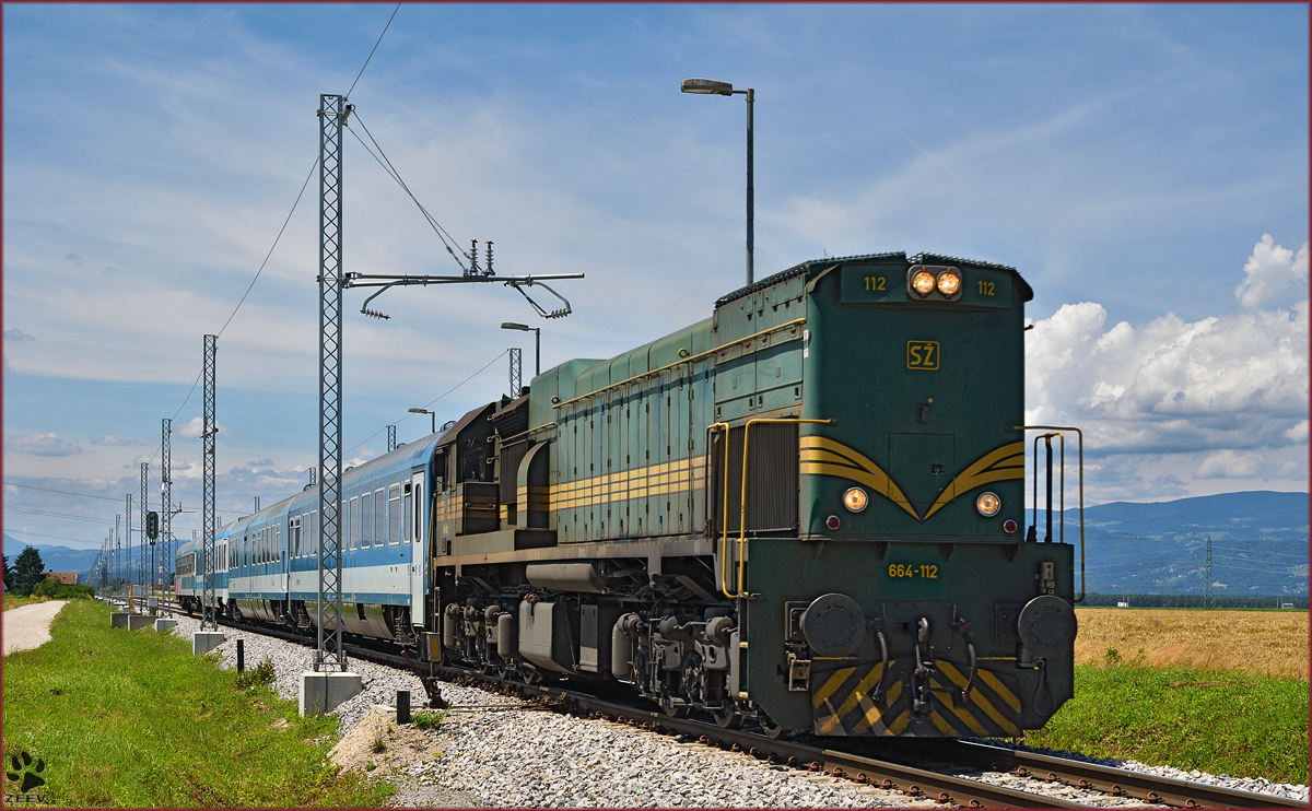 SŽ 664-112 zieht MV247 'Citadella' durch Cirkovce-Polje Richtung Budapest. /22.6.2015