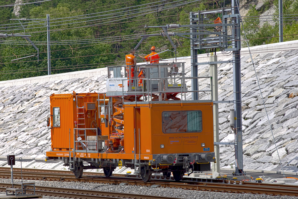 Spezialfahrzeug SEFA II von Kummler+Matter ist mit Montagearbeiten am Nordportal an den Fahrleitungen des Alp Transit Gotthardbasistunnels beschäftigt.Bild vom 27.6.2015