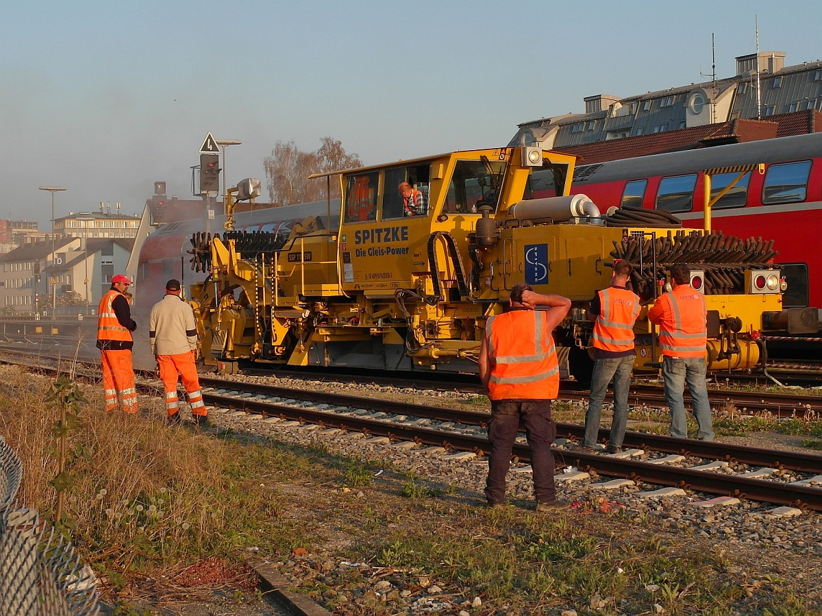 Zwei arbeiten, Fünf schauen zu. Die von Spitzke eingesetzte Schotterplaniermaschine SSP 110 SW (99 80 9425 018-5 ) am 23.04.2015 in Friedrichshafen Stadtbahnhof. Aufnahme entstand vom zwischen den Gleisen und der Wohnbebauung entlangführenden öffentlichen Fußweg.