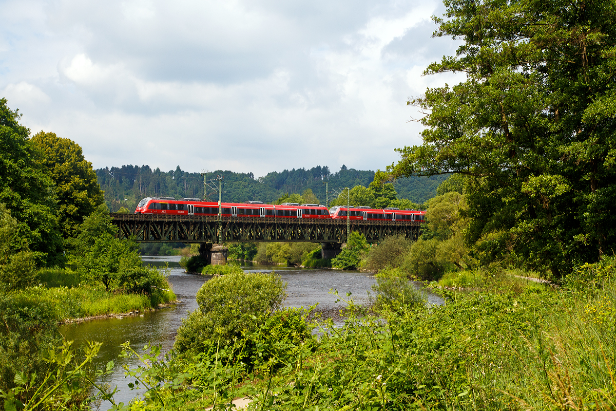 Zwei gekuppelte Bombardier Talent 2 (BR 442 / 443) fahren am 27.06.2015 bei Herchen (zur Gemeinde Windeck im Rhein-Sieg-Kreis), als RE 9 (rsx - Rhein-Sieg-Express) Siegen - Köln - Aachen, über die Siegbrücke und erreichen gleich den Bahnhof Herchen.