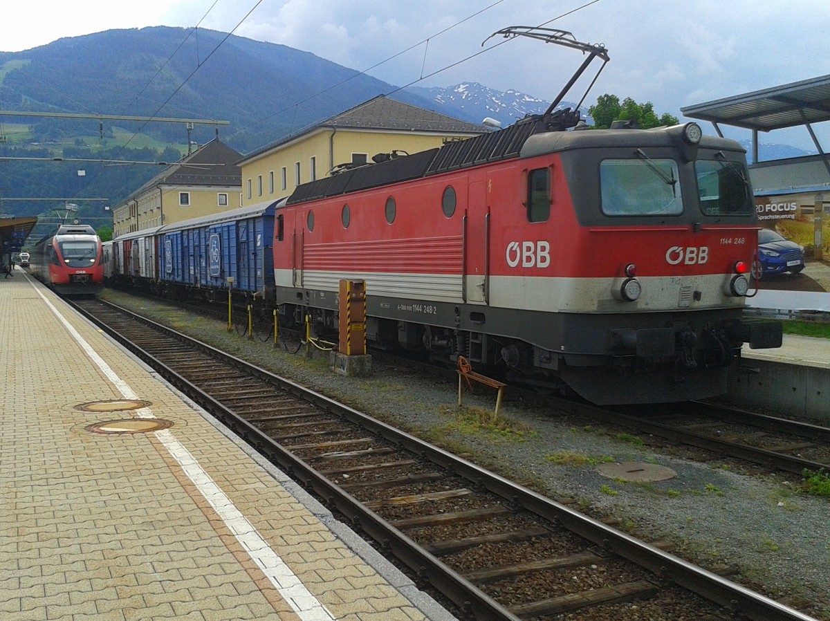 1144 248-2 mit REX 4664 (Lienz - San Candido/Innichen) am 1.6.2015 in Lienz. Ab 13.7. verkehrt dieser Zug mit einer 4-teiligen CittySuttle Doppelstock Garnitur. Diese Züge sind speziell für die vielen Radfahrer aus Südtirol gedacht und verkehren deshalb auch nur in Richtung San Candido/Innichen und fahren dann als Leerzug wieder zurück nach Lienz.