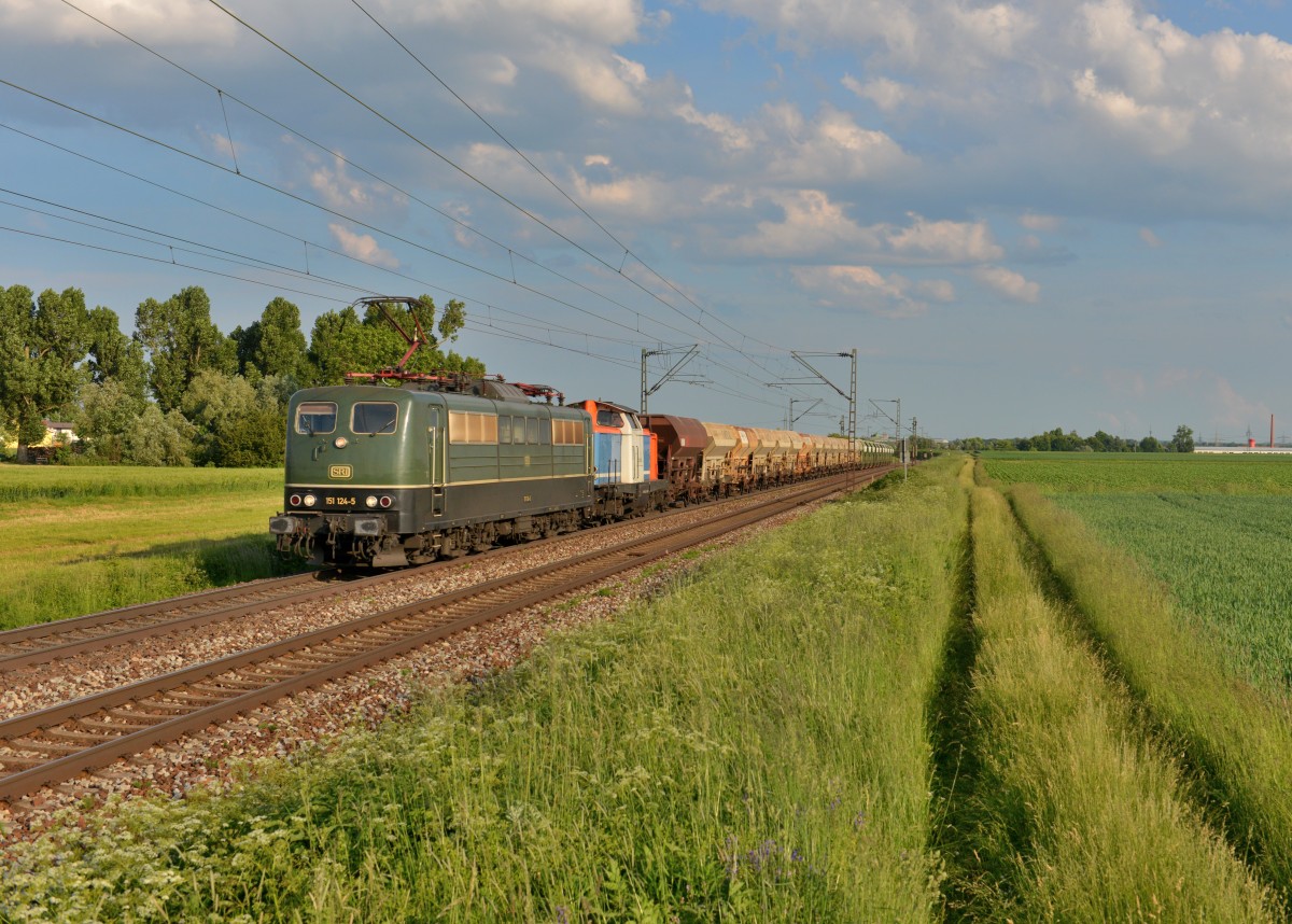 151 124 + 212 063 mit einem Schotterzug am 01.06.2015 bei Plattling.
