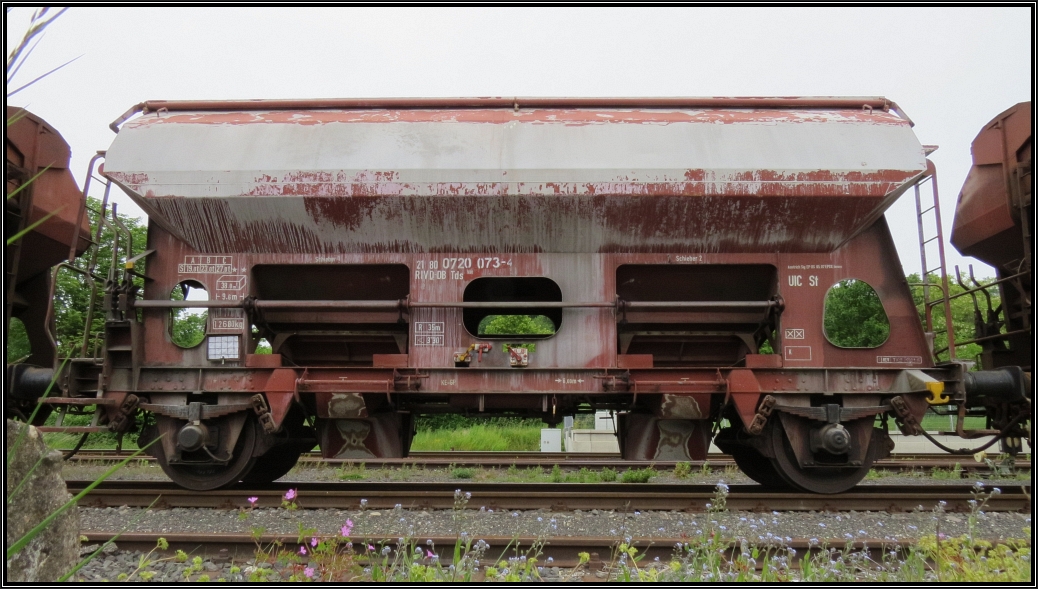 Ein abgestellter Schüttgutwagen deren Revision abgelaufen ist.Gesehen am Bahnhof in Stolberg am 31.05.2015.Für Modelleisenbahner sicherlich interessant die ihre Modelle altern und patinieren.