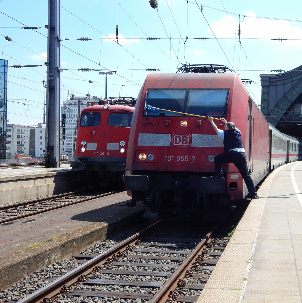 Während der Lokführer der 101 055-2 seiner Lok klare Sicht verpasst versteckt sich 110 491-8 hinter ihrem Nachfolger.