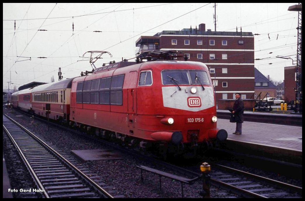 103175 steht am 17.11.1990 mit einem bunt gemixten EC 31 nach Kopenhagen auf Gleis 3 in Osnabrück Hauptbahnhof.