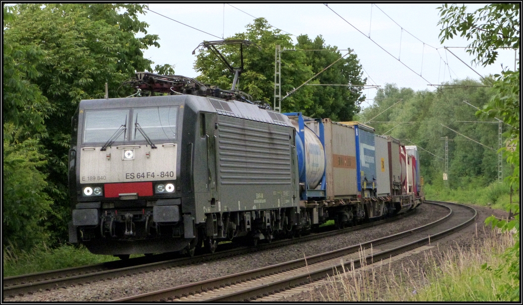 Die E 189 840 ist mit einen Güterzug unterwegs auf der Kbs 485 bei Rimburg. Hier zu sehen am 29.Juni 2015 auf ihrer Fahrt nach Aachen West.