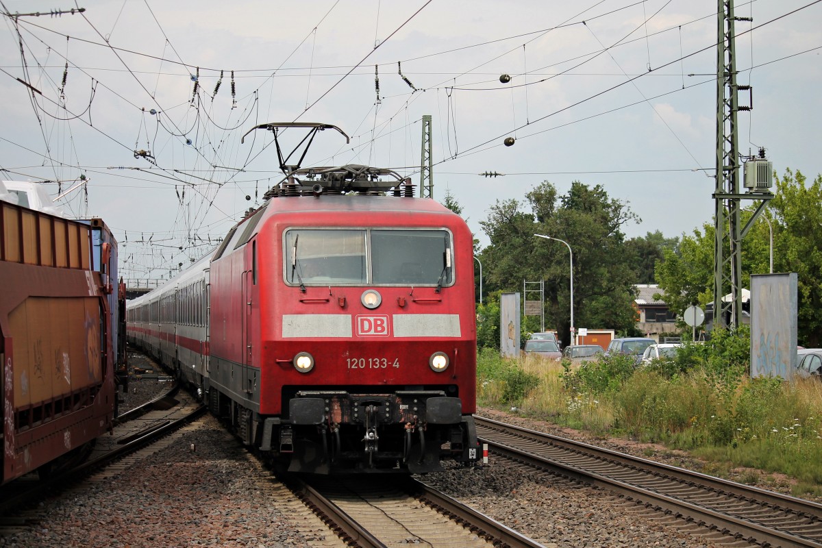 Durchfahrt von 120 133-4 am 23.07.2014 in Müllheim (Baden) mit der Karlsruher KP-Reserve nach Basel.