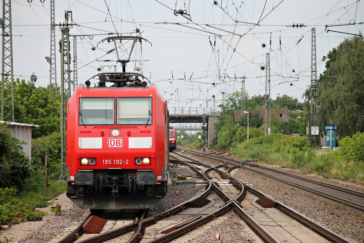 Einfahrt am 23.07.2014 in Müllheim (Baden) von 185 192-2 mit einem gemischten Güterzug von Gleis 13 auf Gleis 5. Im Hintergrund ist schon die Überholende 120 133-4 mit der Karlsruher KP-Reserve zusehen.