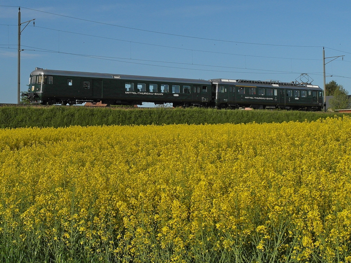 Geplant war eine Aufnahme von einem Rapsfeld mit einem RABe 526. Unerwartet und zur Freude des Fotografen kam der 1965 gebaute ABDe 4/4 12 zusammen mit dem rund zehn Jahre jüngeren BDt 205 vorbei. Der "Thurgauer Zug" des 'Verein Historische Mittel-Thurgau-Bahn' wurde am 10.05.2015 bei Landschlacht aufgenommen.