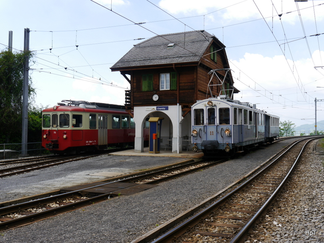 Goldenpass CEV - Fotoextrafahrt für Bahnforum.ch mit den Zahnradtriebwagen BDeh 2/4 73 und BCFe 4/4 11 im Bahnhof Chamby am 16.05.2015