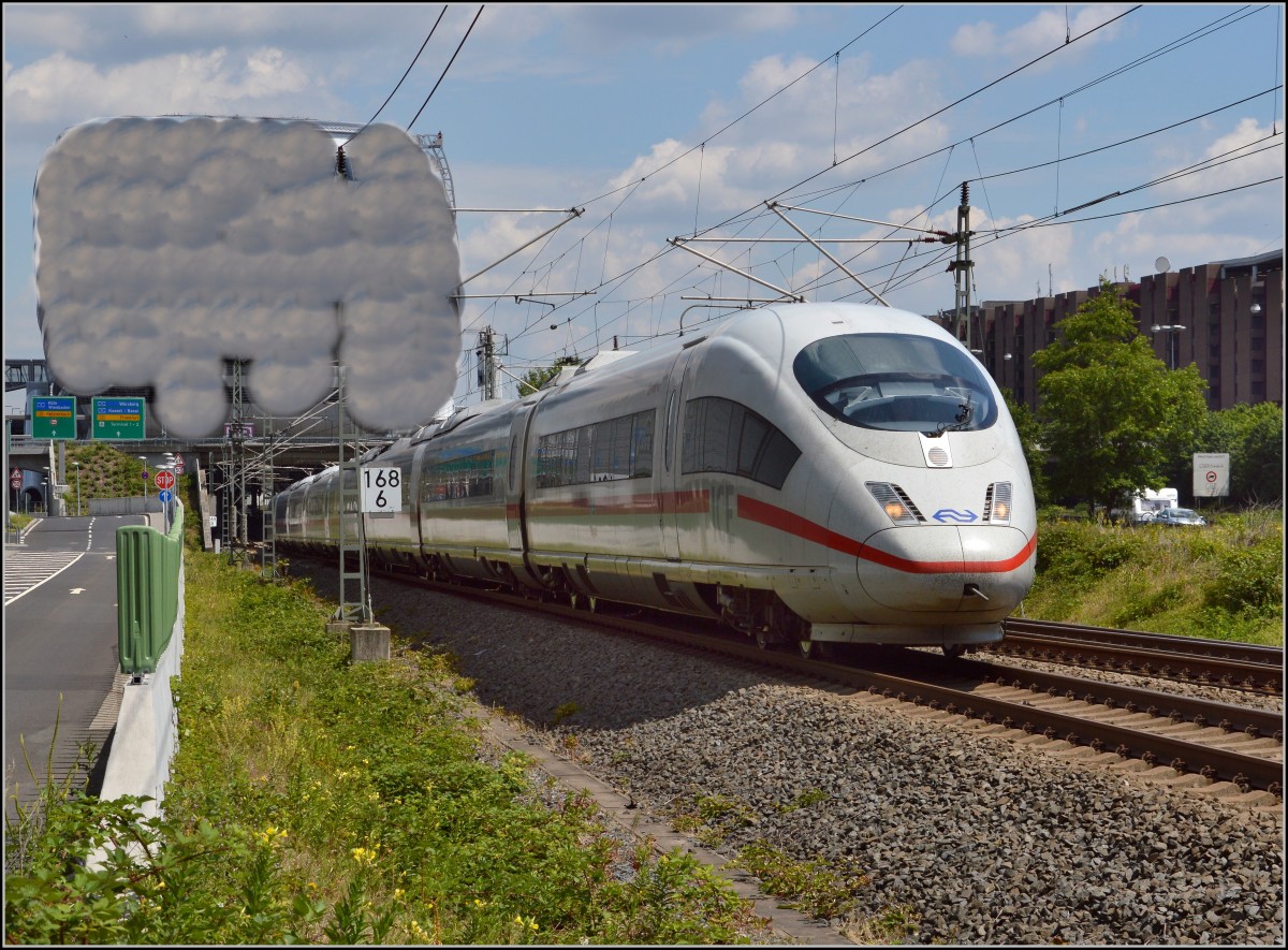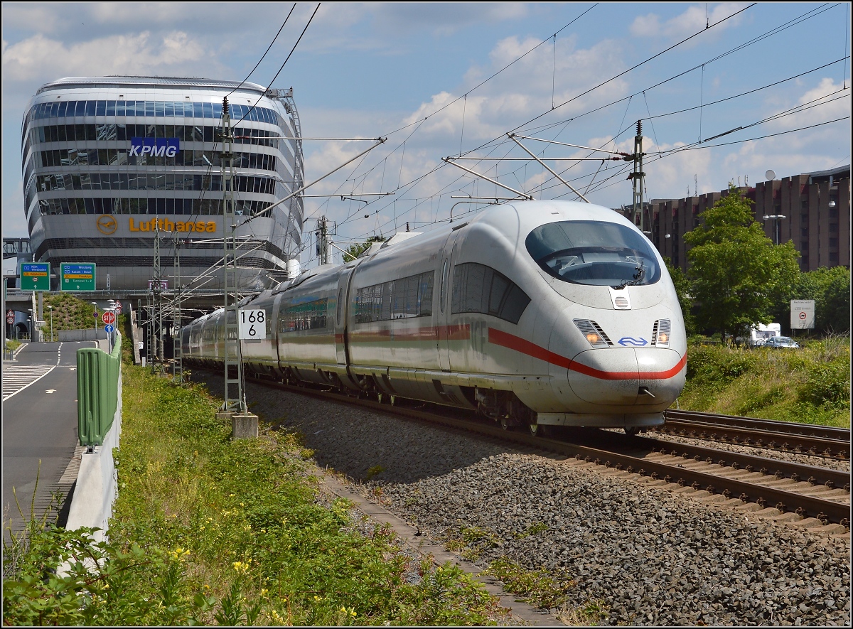 Der tieffliegende Holländer ICE 3 Arnheim bei der Ausfahrt aus dem Fernbahnhof des Frankfurter Flughafen. Juni 2015.