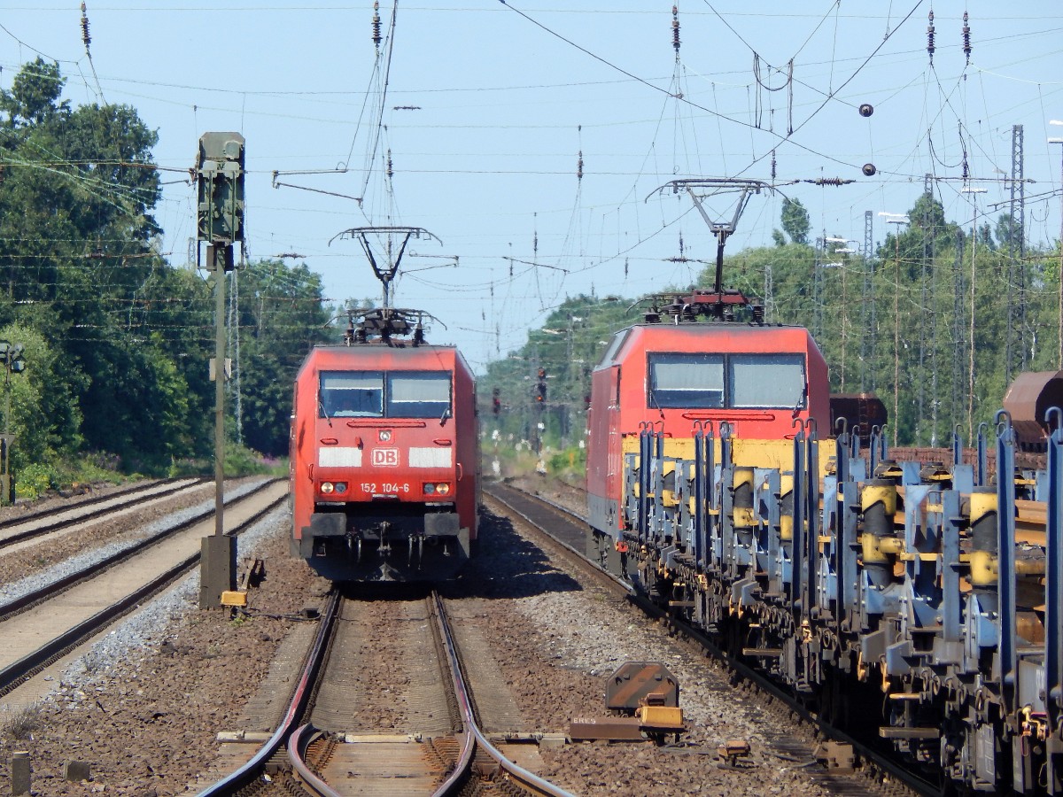 Treffen zweier 152er in Recklinghausen Süd. Links wartet 152 104-6 und rechts fährt 152 053-5.