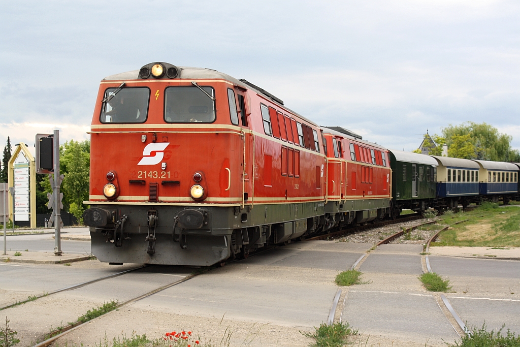 WLB 2143.21 und NLB 2143 070-7 queren mit dem SLP 34468 am 27.Juni 2015 die EK mit der Josef Dunkl-Straße in Mistelbach.