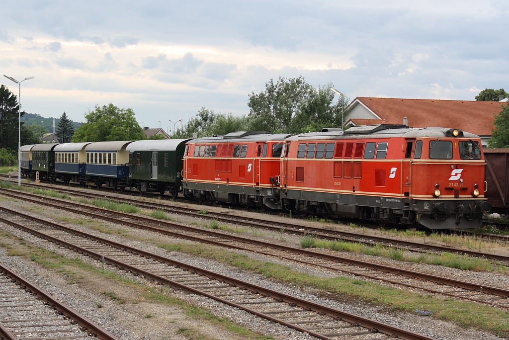 WLB 2143.21 und NLB 2143 070-7 fahren mit dem SLP 34468 am 27.Juni 2015 in den Bf. Mistelbach LB ein.