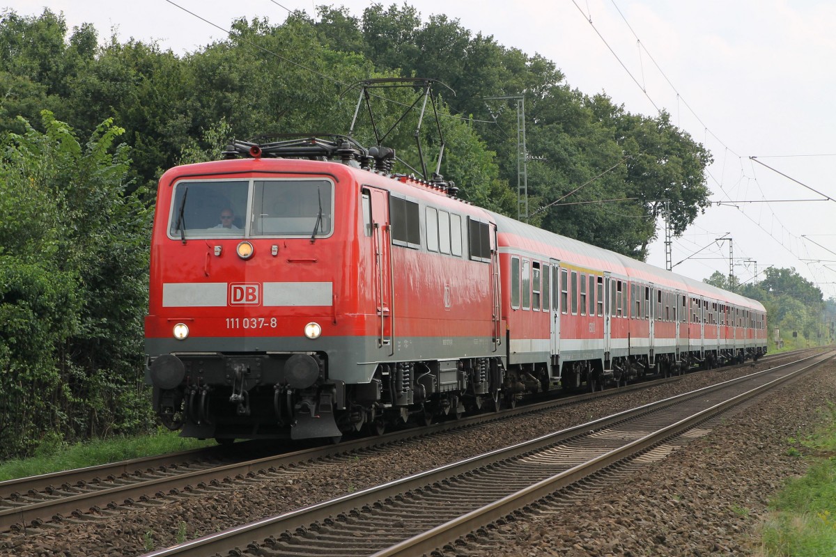 111 037-8 (Baujahr: 1976) mit RB 31776 Münster Hauptbahnhof-Salzbergen bei Salzbergen (am Elsbach) am 1-8-2014.