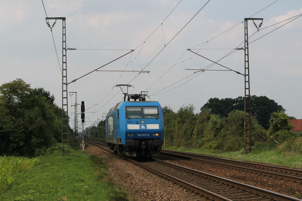 145 023-6 der PRESS (Pressnitzbahn mbH) bei Salzbergen (am Elsbach) am 1-8-2014.