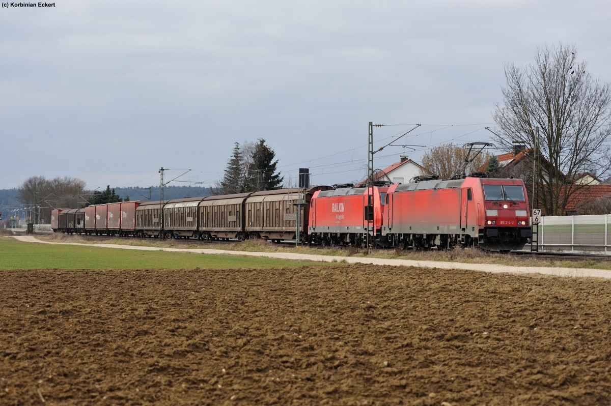 185 314-2 und eine kalte 185 mit einem gemischten Güterzug bei Pölling Richtung Neumarkt Opf.,03.03.2014