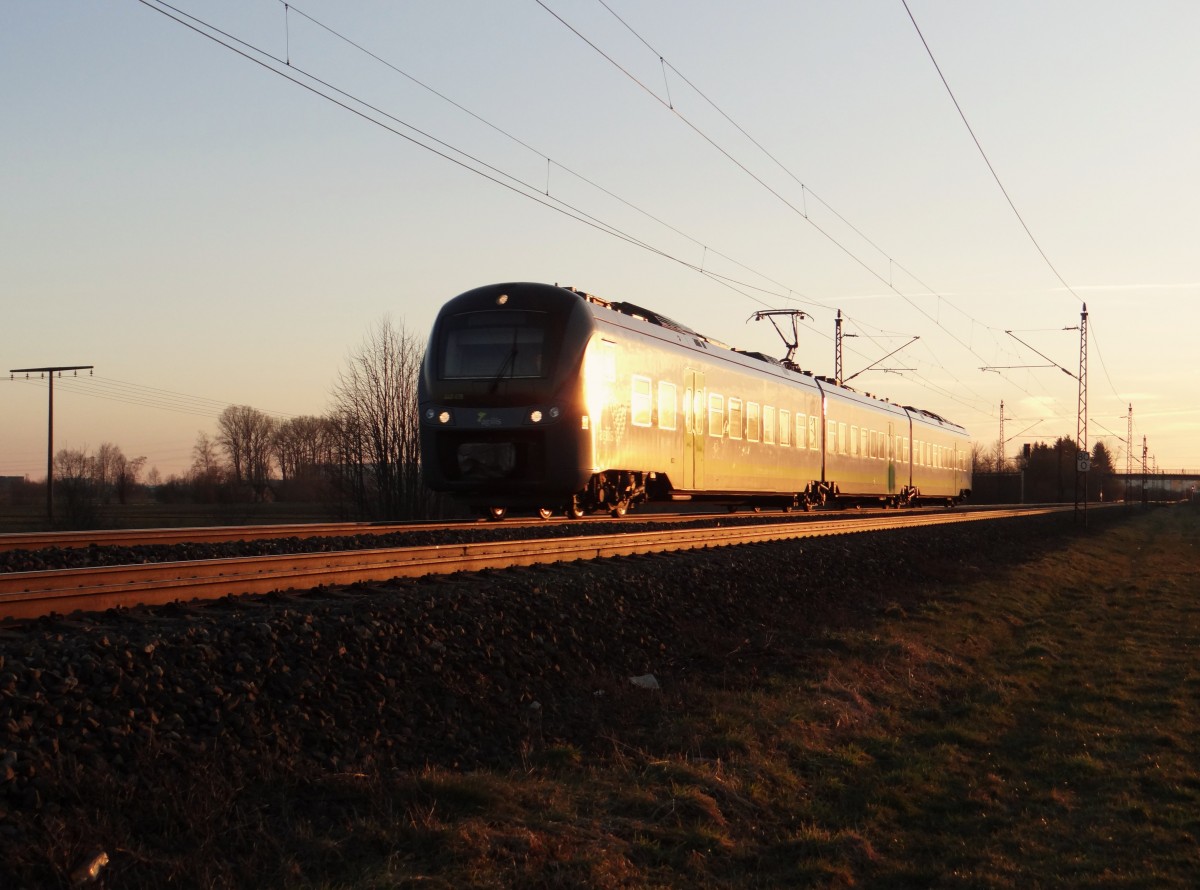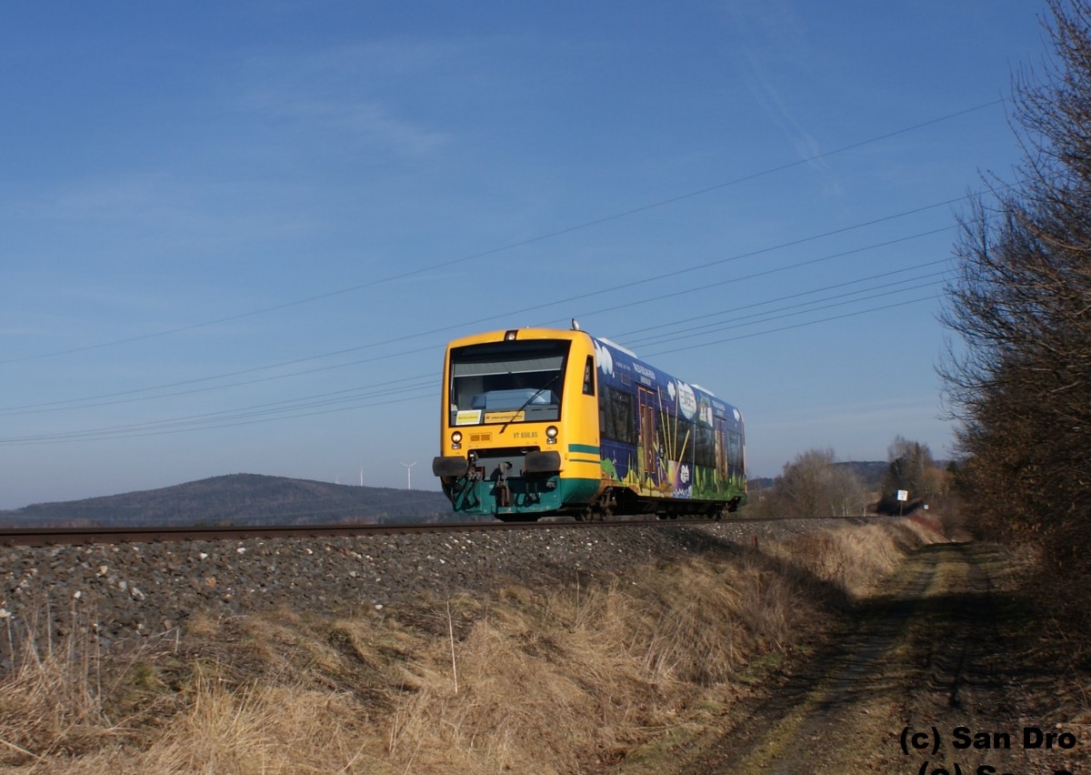 Beklebte Vogtlandbahn VT64 auf dem Weg nach Plauen am 10.03.2015 von der Morgensonne angestrahlt.