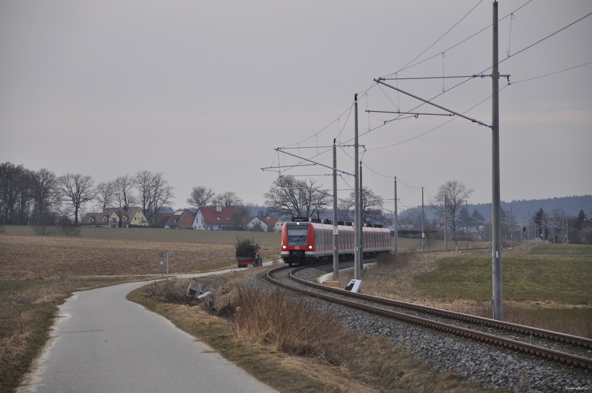 Begegnung zweier "Giganten" … ein Bulldog (Traktor, Trecker…) und 423 124 - 7 als S 2 in Richtung Ostbahnhof, München, bei Deutenhofen am 10.03.2015.