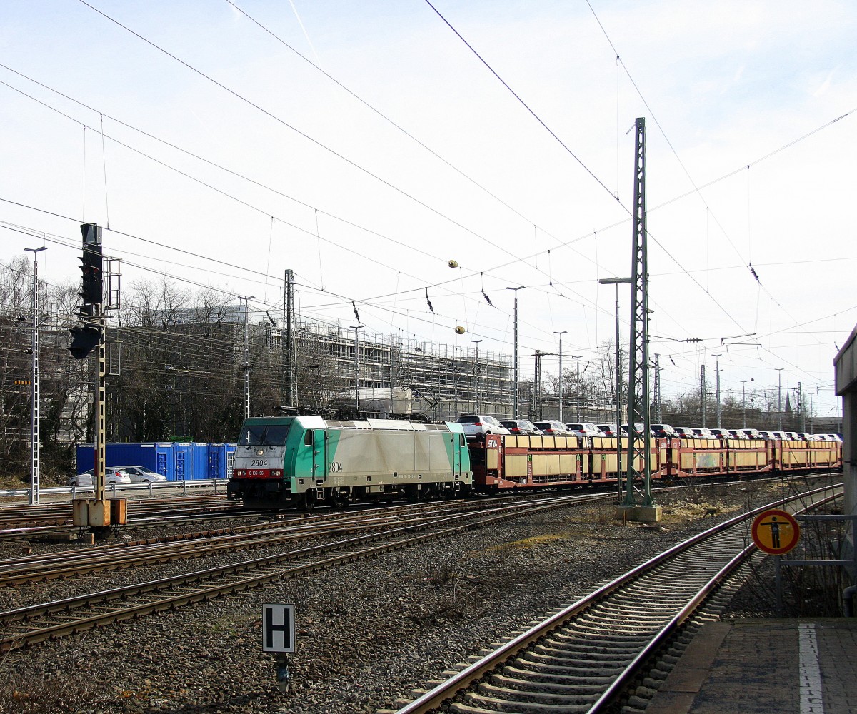 Die Cobra 2804 kommt aus Richtung Montzen/Belgien mit einem sehr langen Toyota-Autozug aus Zeebrugge-Ramskapelle(B) nach Mszczonow(PL) und fährt in Aachen-West ein. Aufgenommen vom Bahnsteig in Aachen-West bei schönem Frühlingswetter am 7.3.2015.